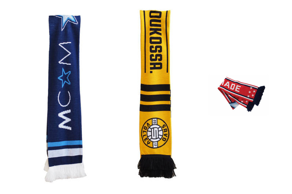 Lämmin liigahuivi seuran omilla väreillä ja logoilla.