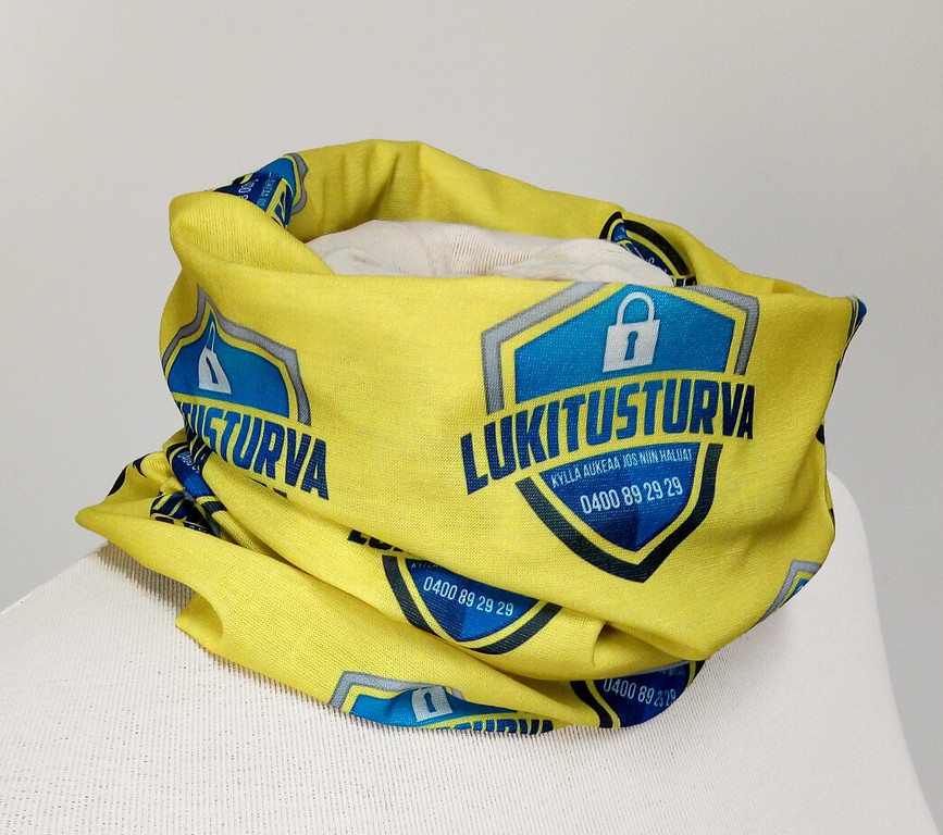 Tuubihuivi seuran omalla täysväripainatuksella eli logolla, väreillä, kuvioilla tai vaikka valokuvilla. Hinta sisältää putkihuivin, painatuksen sommitelun ja sen täyden sublimaatiopainatuksen.