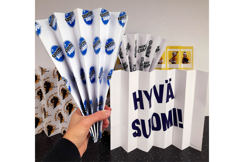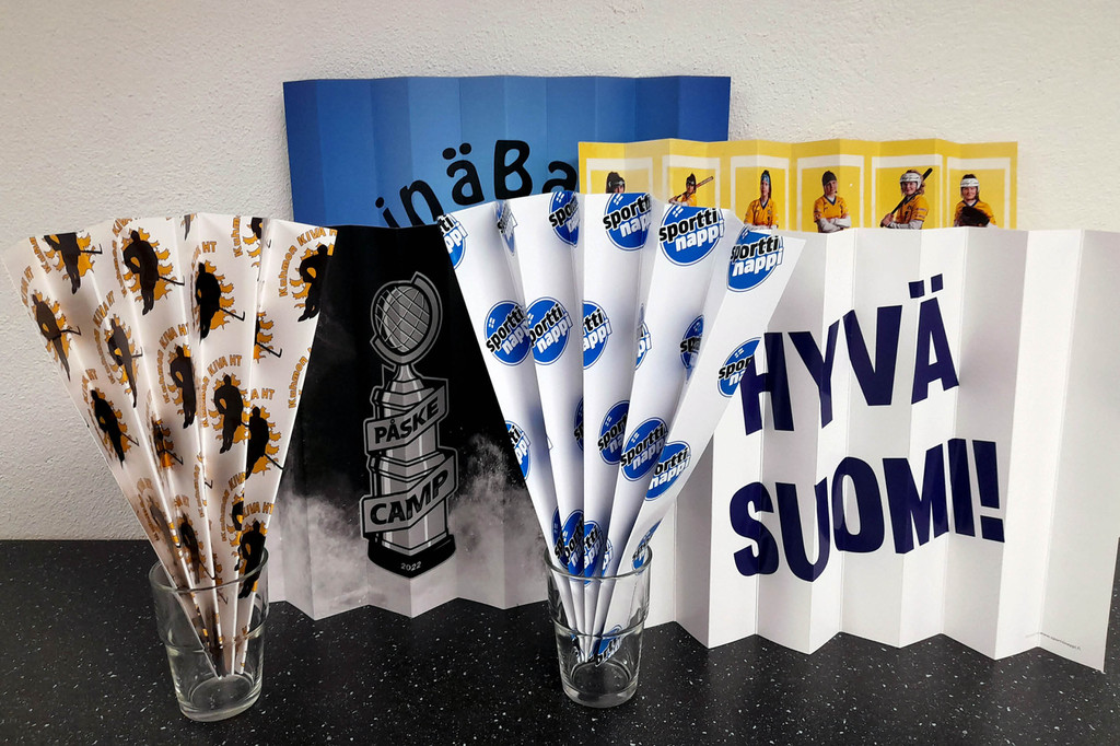 Kartonkinen haitariksi taiteltava kannustusviuhka, johon mahdollista myydä mainostilaa.