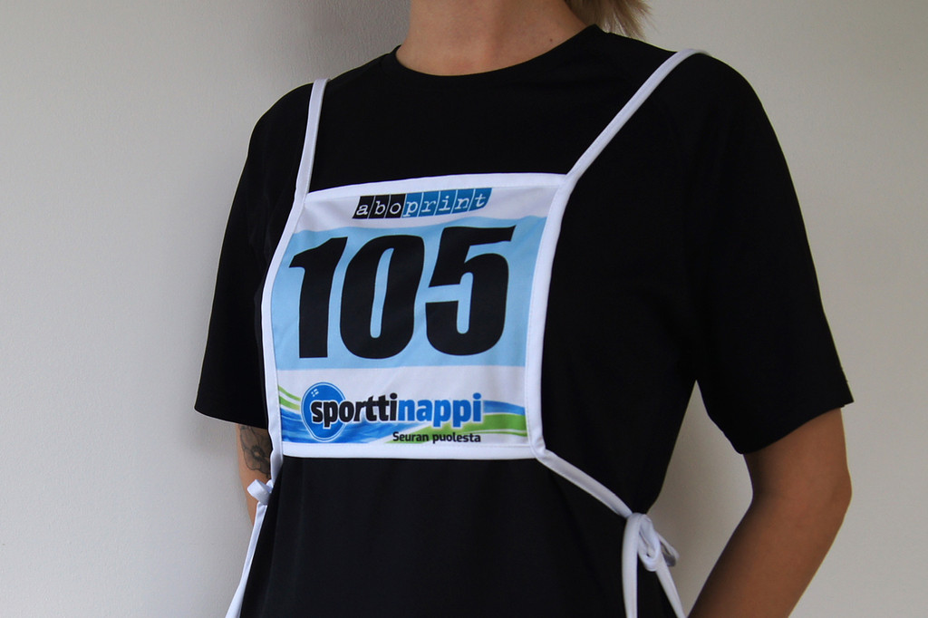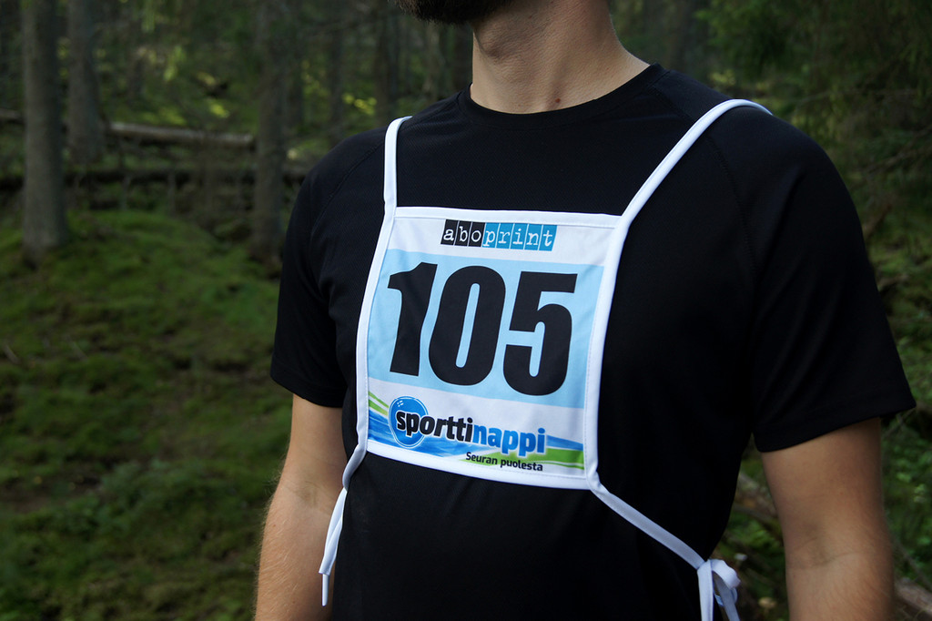 Täyspainetut kilpailunumerolaput (edessä ja takana) nauhakiinnityksellä.